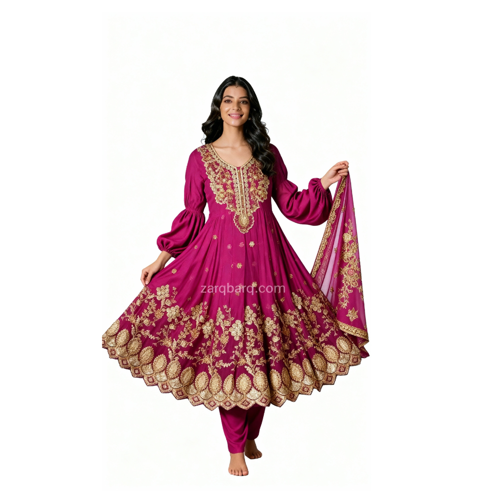 This exquisite three-piece magenta frock dress in chiffon features intricate sequence work and delicate embroidery, enhancing its visual appeal with rich texture and elegance. The shimmering sequences, paired with fine embroidery, creates a sophisticated and modern design, its luxurious detailing and refined style offers a timeless-statement, making it an ideal choice for formal occasions.
